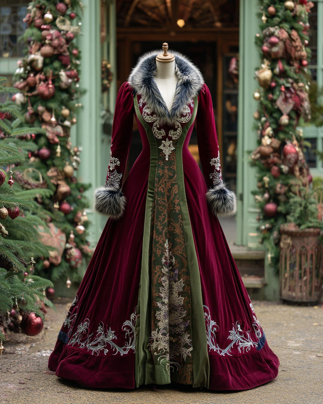 Women's Christmas-Themed Contrasting Color Beaded Embroidered Velvet Dress 1797