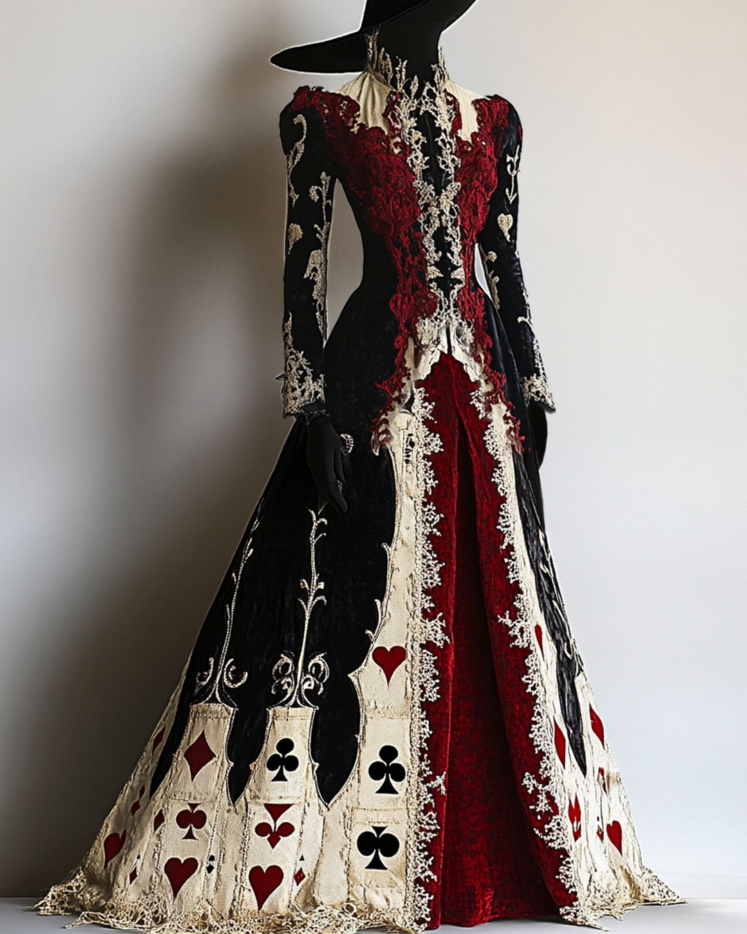 Witch-Themed Contrast-Color Poker Embroidered Lace Patchwork Velvet Dress 4872