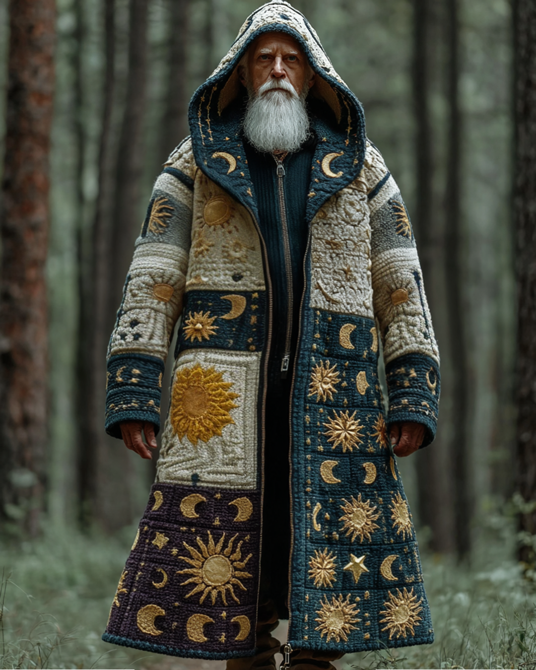 Men's Viking-Themed Contrast-Color Star-and-Moon Embroidered Patchwork Hooded Knit Coat 4638
