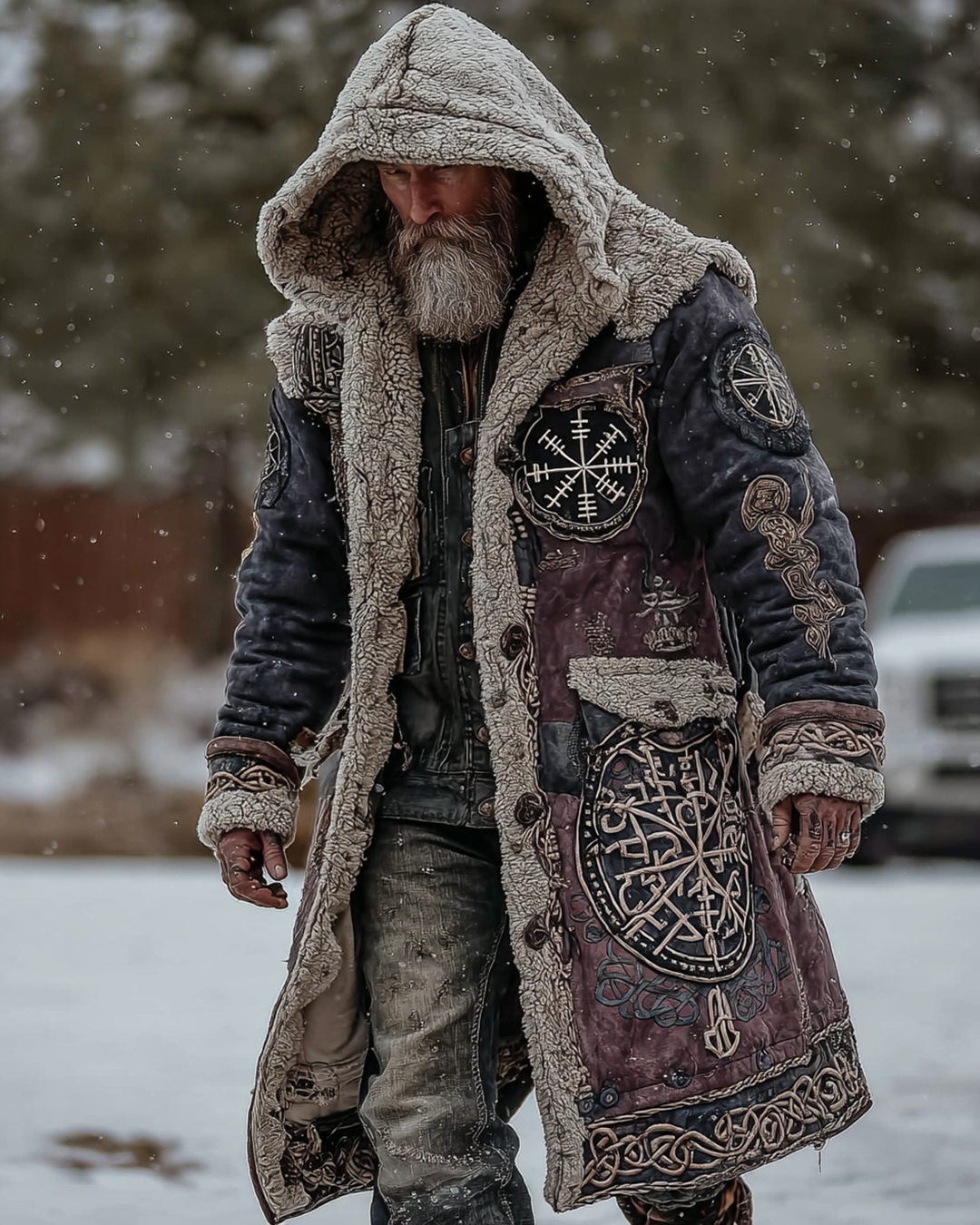 Men's Viking-Themed Contrast-Color Compass Embroidered Wool Coat 6224