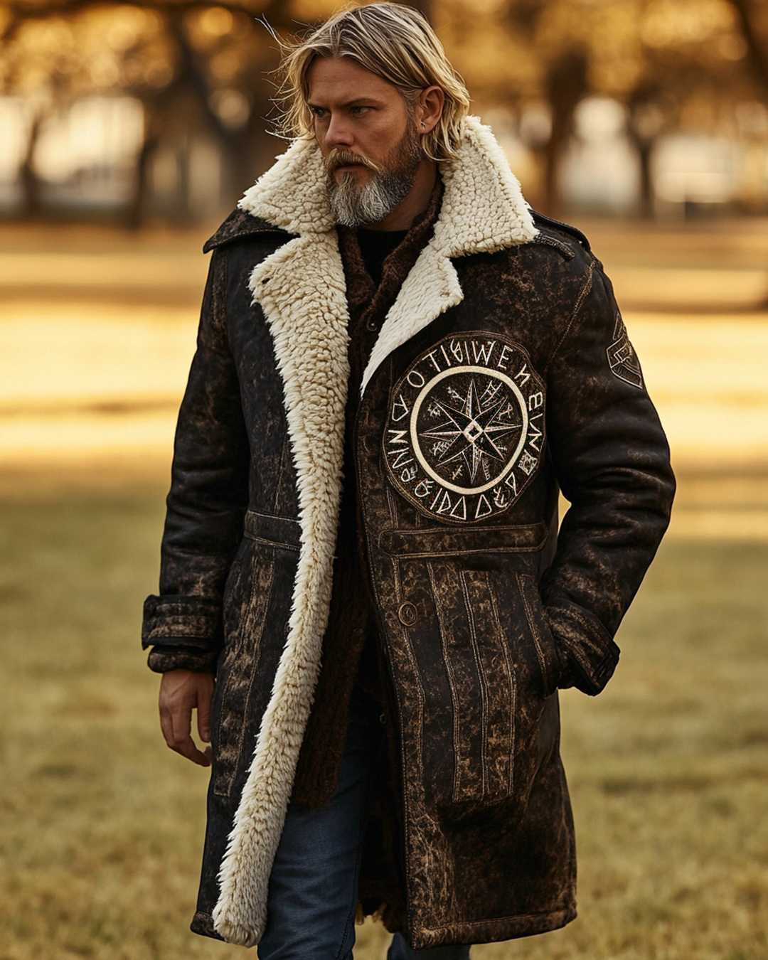 Men's Viking-Themed Contrast-Color Compass Embroidered Hooded Coat 8810