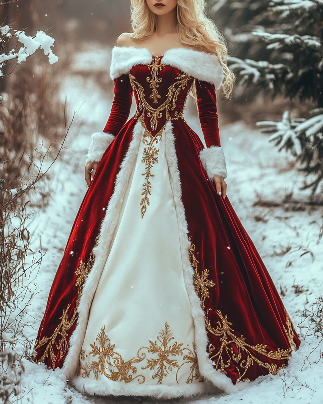 Women's Christmas-Themed Contrasting Color Beaded Embroidered Velvet Dress 1797