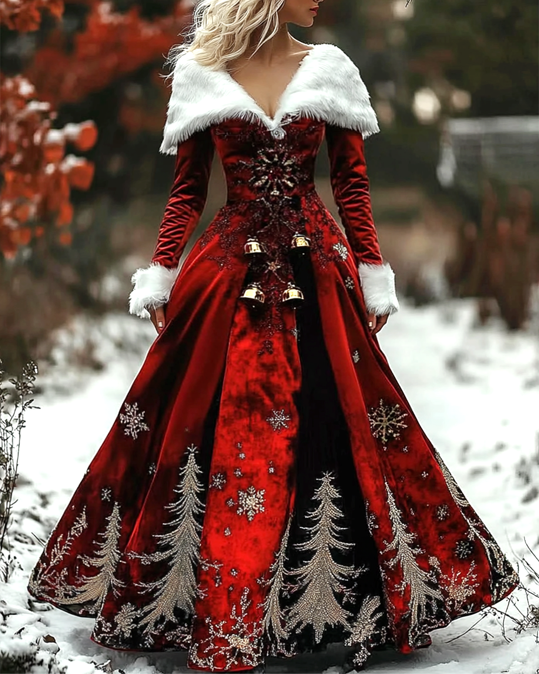 Women's Christmas-Themed Contrasting Color Christmas Tree Beaded Embroidered Velvet Dress 8717