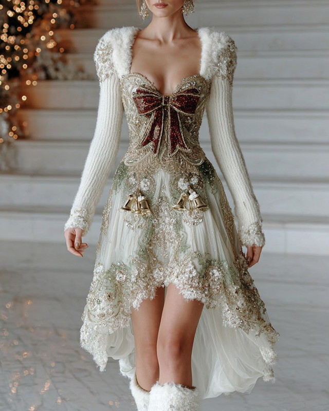 Women's Christmas-Themed Irregular Ruffled Christmas Bow Beaded Embroidered Dress 5889