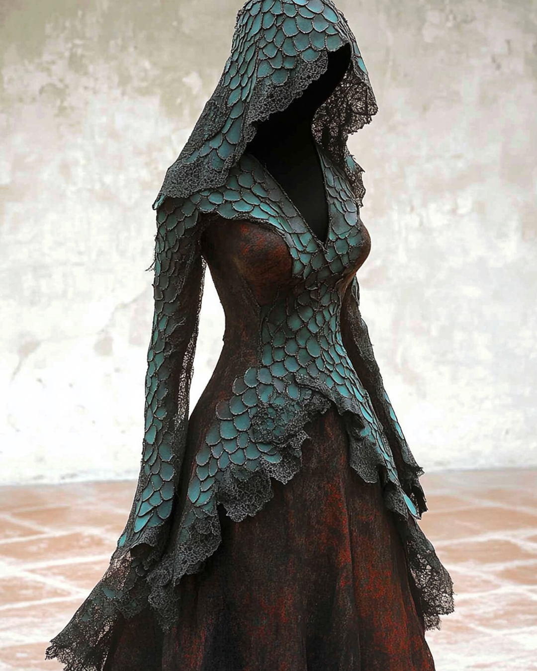 Women's Scale Embroidered Lace Paneled Witch Gothic Dress 2391